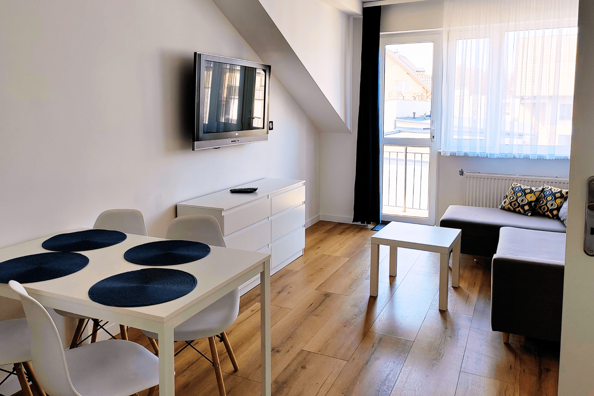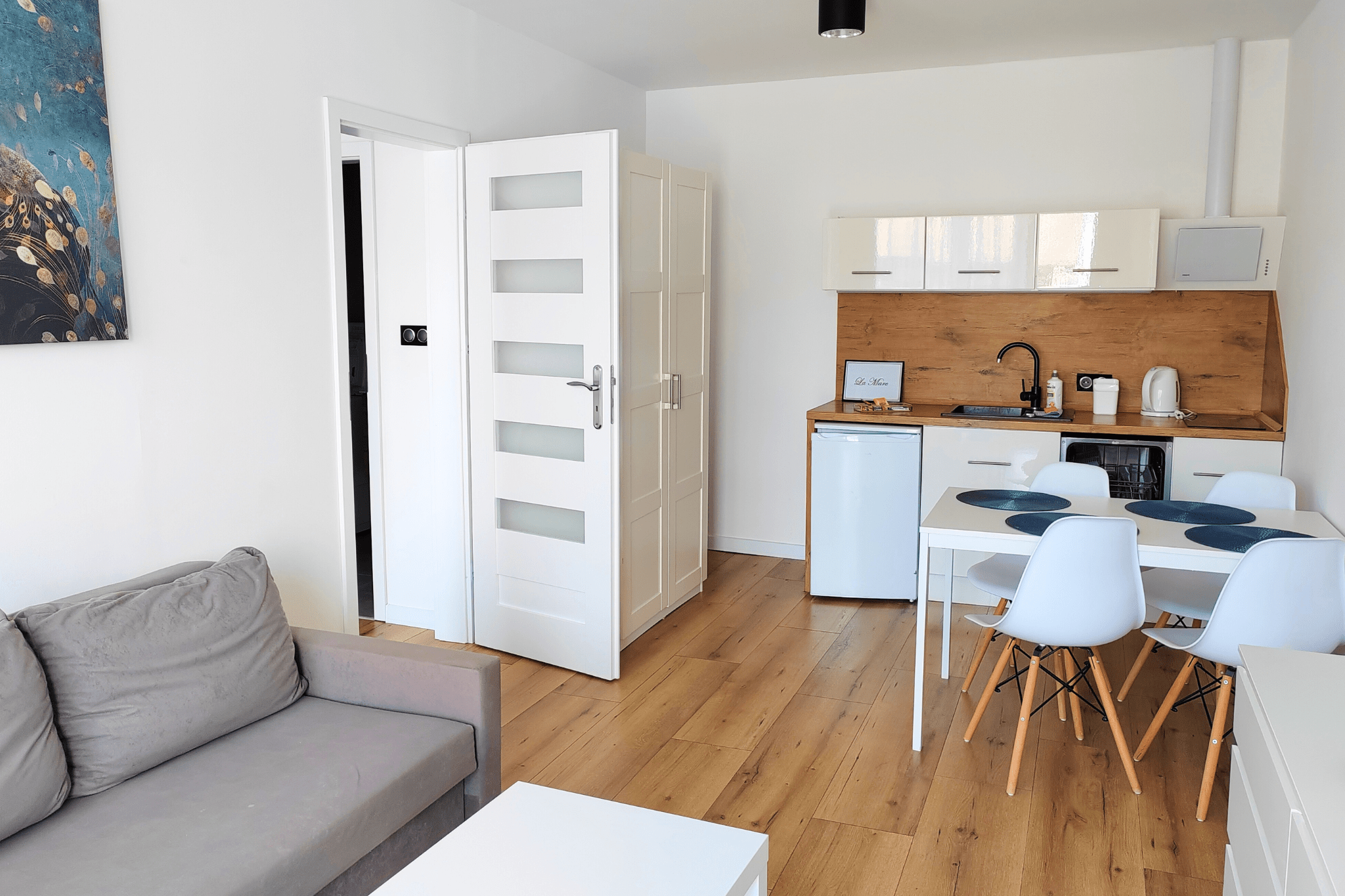 - aneks kuchenny z płytą elektryczną, zmywarką, czajnikiem, lodówką oraz kompletem naczyń i sztućców,